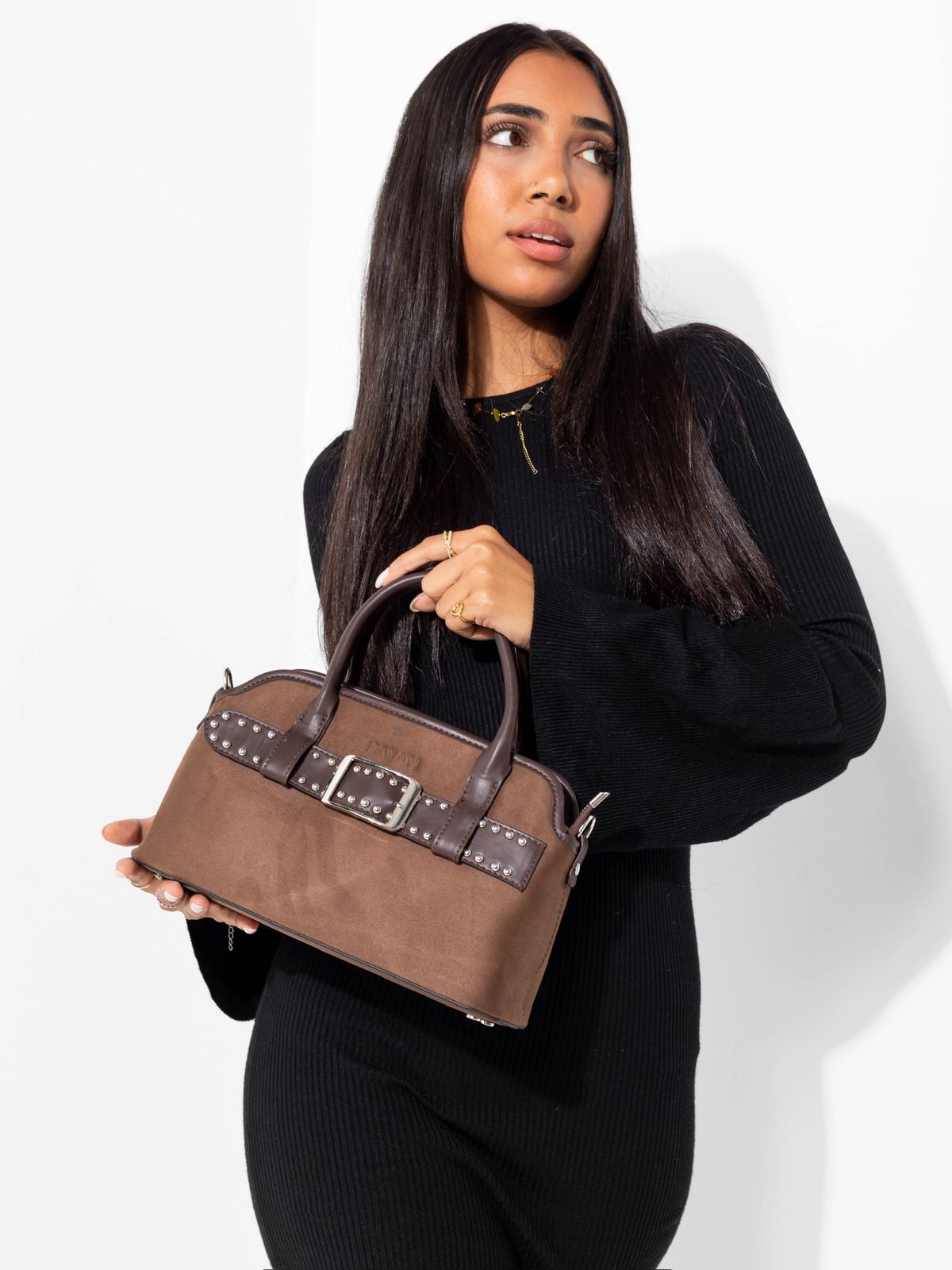 A sleek, structured handbag crafted from premium suede leather. Designed with dual top handles, an adjustable crossbody strap, and a bold studded buckle detail. Spacious, secure, and perfect for elevating any everyday look